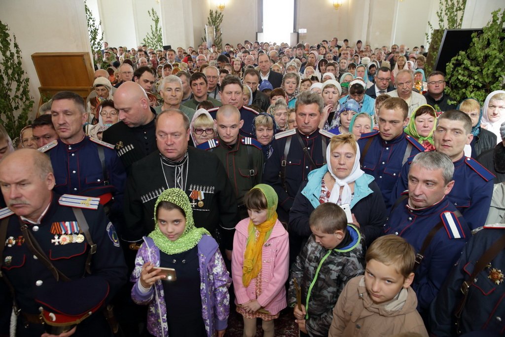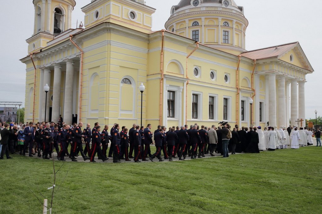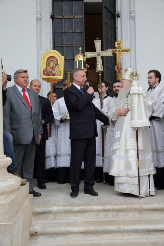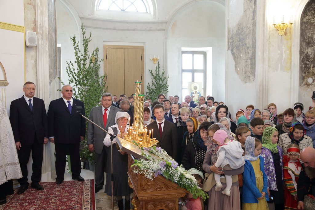 По заамвонной молитве состоялся крестный ход, в завершение которого на паперти храма со словами приветствия к митрополиту Ювеналию обратился А. Д. Беглов: «Ваше Высокопреосвященство, досточтимые Владыки, отцы честные, братья и сестры, братья казаки! Дорогой Владыка Ювеналий, хотел бы всех поздравить с престольным праздником сошествия Святого Духа на апостолов. Огромное Вам спасибо за то, что вы сегодня освятили этот храм. Сюда будут приходить люди не только из этого поселка, но и из окрестных деревень. Будут молиться и спасаться. Я хотел бы поблагодарить всех участников восстановления этого храма. И Вас, Владыка, и Попечительский совет, и благотворителей, и простых прихожан, которые длительное время принимали участие в востановлении порушенного храма. Хотел бы сказать слова благодарности и строителям, которые качественно восстанавливали порушенную святыню. В день престольного праздника этого храма я хотел бы от лица Попечительского совета и благотворителей преподнести настоятелю ковчег со святыми мощами. Большое всем спасибо, всех с праздником!»