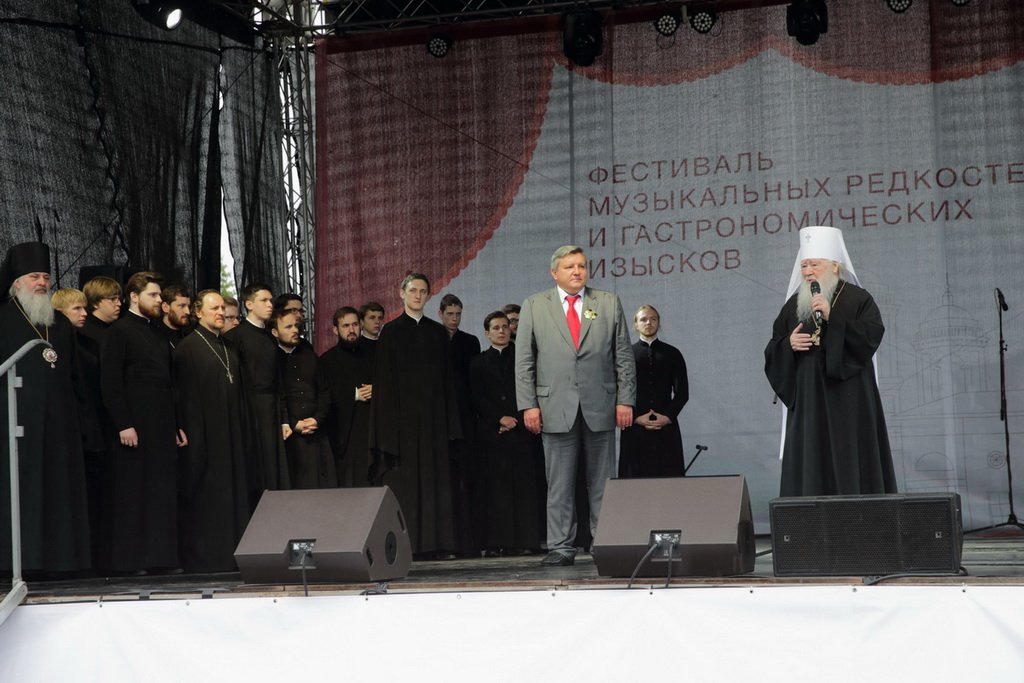 Затем на площади перед храмом состоялся праздничный фестиваль. К участникам фестиваля с архипастырским словом обратился митрополит Ювеналий: «Дорогие и возлюбленные братья и сестры. Мы сейчас оказались под воздействием непогоды. Но что это по сравнению с тем, что шестьдесят лет здесь храм находился в поругании. Мы не могли здесь молиться, мы не могли здесь крестить и воспитывать детей. Прошли эти мрачные десятилетия. Нам передали этот храм, однако, что может сделать горстка людей, тружеников бедных, чтобы восстановить такую святыню. Если бы не нашелся один святой человек в лице Николая Павловича, наверное, и сейчас вы не переступили бы порог этого храма. Много нужно было сил, средств, усилий, чтобы за три коротких года открыть эту святыню для православных людей. Я преклоняюсь перед вашим подвигом, дорогие братья и сестры! Благодарю вас, что после богослужения остались с нами, чтобы почтить тех, чьими руками и личными средствами осуществлялась реставрация. Всех их вдохновил наш любимый Николай Павлович. Святейший Патриарх Кирилл очень высоко оценил его подвиг, удостоив ордена Русской Православной Церкви преподобного Серафима Саровского I степени.
