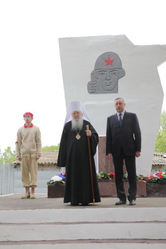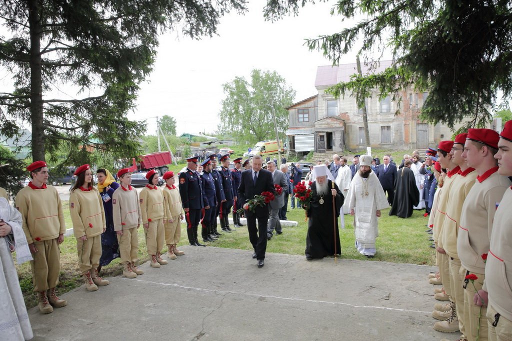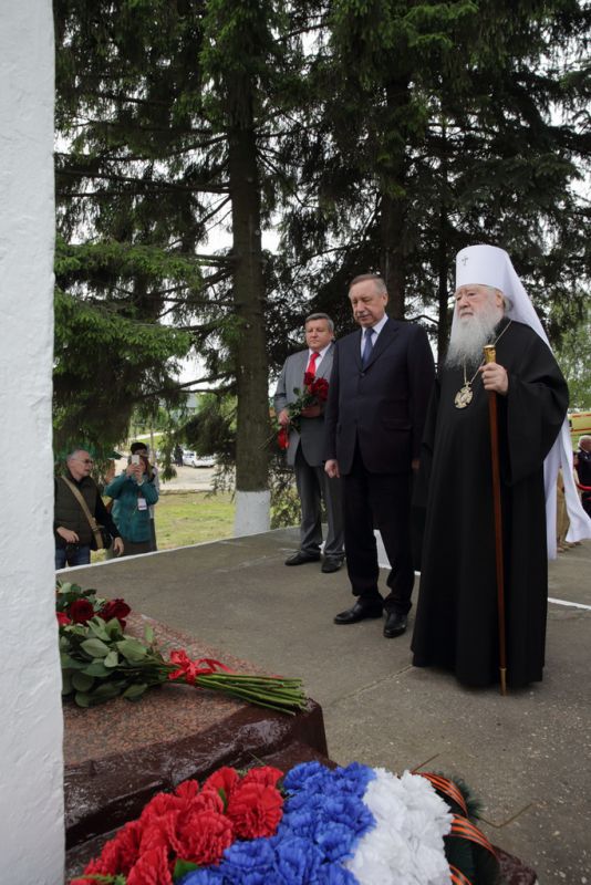 Перед началом богослужения Владыка митрополит и полномочный представитель Президента Российской Федерации в Центральном федеральном округе А. Д. Беглов почтили память погибших в годы Великой Отечественной войны и возложили цветы к воинскому мемориалу села Шкинь.