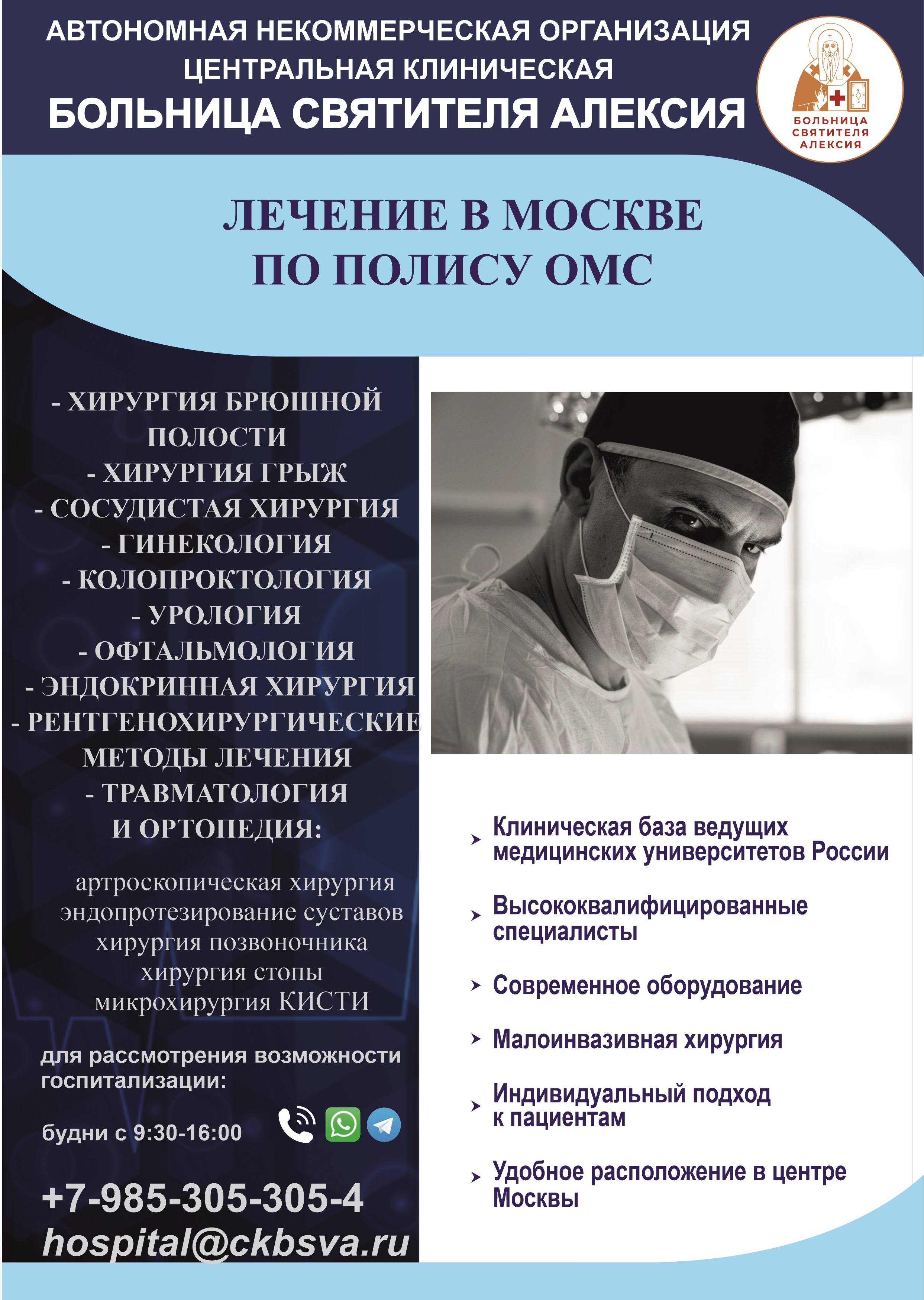 О возможности прохождения лечения в больнице свт. Алексия по полису обязательного медицинского страхования (ОМС)