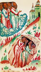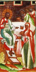 Если Адам был «женскими глаголами прельщен», то Священное Писание дает нам образ и того, как усердствующие в покаянии жены не только сподоблялись личного спасения, но и других к покаянию обращали. Пример тому — самармярянка, беседовавшая у колодца Иаковля со Спасителем: И многие Самаряне из города того уверовали в Него по слову женщины, свидетельствовавшей, что Он сказал ей все, что она сделала (Ин. 4:39). Изображения этой встрече нередки — их можно найти и в книжной миниатюре, и в иконописи, и в храмовой росписи. Если на миниатюре учительного Евангелия изображено самое начало беседы Господа с самарянкой, то на суздальской иконе конца XVI в. композиция включает еще и апостолов, и соплеменников самарянки: И многие Самаряне из города того уверовали в Него по слову женщины, свидетельствовавшей, что Он сказал ей все, что она сделала. И потому, когда пришли к Нему Самаряне, то просили Его побыть у них; и Он пробыл там два дня. И еще большее число уверовали по Его слову (Ин. 4:39–41).
