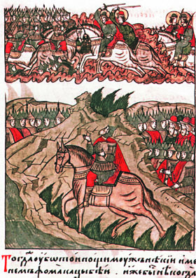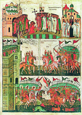Древнерусские иллюстрированные рукописи, особенно рукописи Лицевого свода, содержат множество миниатюр, посвященных военной тематике. Это далеко не всегда сцены победы над врагом; наша история помнит и немало поражений. Но и в сценах, посвященных неуспешным сражениям, показан героизм, мужество, жертвенность воина Святой Руси. Эти качества русского воина, несомненно, основывались на вере Христовой: Если ополчится против меня полк, не убоится сердце мое; если восстанет на меня война, и тогда буду надеяться (Пс. 26:3) — так мог сказать любой защитник земли Русской.