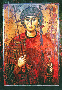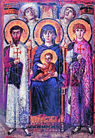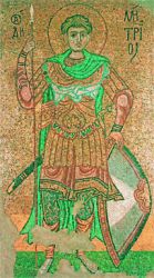 Именно таковым предстает великомученик Димитрий на мозаичной иконе, хранящейся ныне в Третьяковской галерее [6, с. 93; 1, т. 1, с. 49]. Святой изображен фронтально, в рост — словно военачальник на параде. Правой рукой он легко придерживает копье, именно так придерживает, как в парадном строю — легко; его не надо будет метать, оно сейчас не оружие нападения, а один из символов победы. За спиной у пояса — меч в ножнах; победа одержана, и нет нужды держать меч обнаженным. Он препоясан силою для войны (2 Цар. 22:40). Святой словно говорит со спокойным достоинством: узнает весь этот сонм, что не мечом и копьем спасает Господь, ибо это война Господа, и Он предаст вас в руки наши (1 Цар. 17:47).