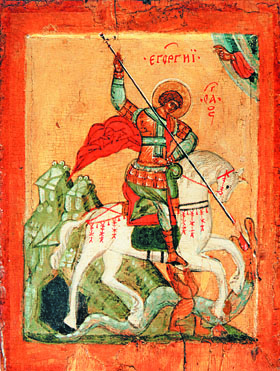 Еще одна известная иконографическая традиция — конный воин, поражающий врага. Самое известное из изображений этого типа — Чудо св. Георгия о змие, получившее известность с XII в. [6, сс. 101, 111]. Этот иконографический сюжет стал одним из наиболее распространенных символов воинской победы на Руси, где святой великомученик Георгий издавна почитается как покровитель воинства. Древнейшее изображение Чуда Георгия о змие — фреска церкви св. Георгия в Старой Ладоге (XII в.).