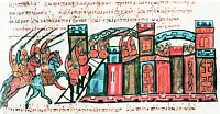 В православной иконографии известны и «батальные сцены». Первоначально появляются они в миниатюрах рукописей. Один из ярких примеров — византийская рукописная Хроника Иоанна Скилицы XII в., хранящаяся в Национальной библиотеке в Мадриде [6, с. 128, 237]. Здесь изображено одно из успешных сражений императора Никифора Фоки (Х в.). Миниатюра имеет ряд интересных деталей, точно передающих тонкости боевого искусства того времени. Здесь можно видеть и атаку конным строем, и воинов, взбирающихся на стены крепости по штурмовым лестницам, и ближний бой на крепостной стене. На других миниатюрах, столь же непритязательных по технике исполнения, можно видеть сцены рукопашного боя (осада арабами Фессалоник), вражеские военные суда и другие интересные детали [12].