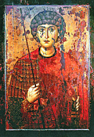 Заслуживает внимания и щит: он стоит позади, и святой Димитрий придерживает его левой рукой. Щит