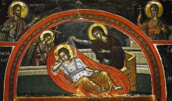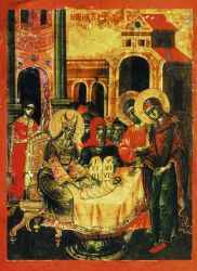 Именно поэтому сюжет обрезания в иконографии младенческого возраста Спасителя весьма редок. Даже в позднейших композициях Рождества Христова, изобилующих подробнейшими деталями евангельского описания событий, обрезания мы не находим. Так, на палехской иконе начала XIX в. можно найти все, кроме сцены обрезания.