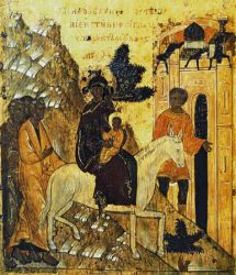 Бегство Святого семейства в Египет — сюжет, широко распространенный в западной живописи, в нашей иконографии сравнительно редок. Как правило, это либо деталь сложной композиции Рождества Христова, либо клеймо иконы Богоматери, как, например, на двух иконах XVI в.