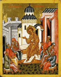 Следующее после бегства Святого семейства в Египет событие из детства Спасителя, упоминаемое в Евангелии, — беседа двенадцатилетнего Иисуса с учителями Израилевыми в Иерусалимском храме (Лк. 2:42–52). Раннехристианские сюжеты, показывающие сидящего среди учителей Христа, можно найти уже в росписях катакомб, но, по выражению