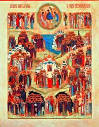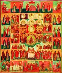 Но иконография Собора русских святых, окрыленных видениями тайными и достигших жилищ небесных, складывается значительно позднее. Конечно, иконы каждого из новопрославленных святых появлялись следом за их канонизацией. Но собрать в едином иконном пространстве весь собор угодников Божиих Святой Руси удалось только в первой половине ХХ в.
