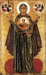 Первые иконы Пресвятой Богородицы появились там, где проходила Ее земная жизнь — в Палестине, но уже в первые десятилетия существования Константинополя все главные святыни, связанные с Нею, перемещаются в этот город — новую столицу империи, принявшей Христа [Квливидзе, с. 501]. В Византии складывается почитание Матери Божией как Покровительницы столицы: Град Твой сохраняй, Богородительнице Пречистая; в Тебе бо сей верно царствуяй, в Тебе и утверждается, и Тобою побеждаяй, побеждает всякое искушение… В словах Богородична