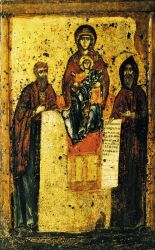 К этой же иконографической традиции относится и киевская икона второй половины XIII в. — Богоматерь Печерская (Свенская) с предстоящими преподобными Антонием и Феодосием. Находилась икона в Свенском монастыре недалеко от Брянска, где, по преданию, был в 1288 г. исцелен от слепоты черниговский князь Роман Михайлович, основавший в том месте обитель. То же предание говорит, что икона была принесена в новый монастырь из Киевского Успенского Печерского монастыря, где была написана в начале XII в. преподобным Алипием Печерским. Надо отметить, что Свенская икона является древнейшим изображением основоположников русского монашества. Текст на довольно хорошо сохранившемся свитке, который держит в руках преподобный Антоний, гласит: «Молю вас так, чада: держимся воздержания и не ленимся, имея в сем Господа помощником» [Древнерусское иск., с. 70–72].
