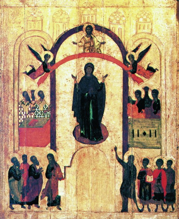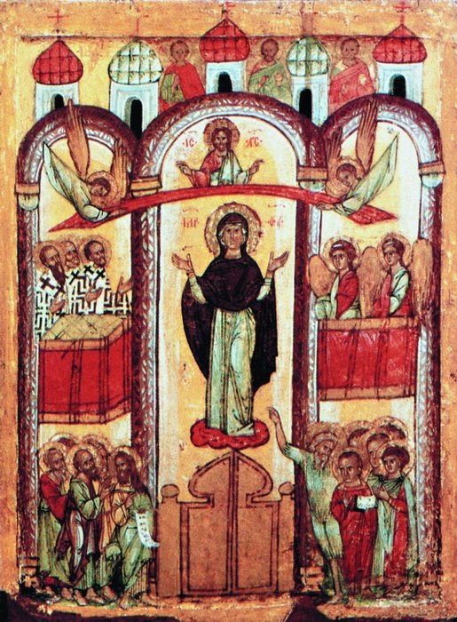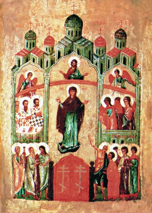 Идея единения нашла отражение и в ранних русских иконах Покрова Пресвятой Богородицы. Как писал кн.