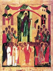 Дева днесь предстоит в церкви и с лики святых невидимо за ны молится Богу: Ангелы со архиереи поклоняются, апостоли же со пророки ликовствуют, нас бо ради молит Богородица превечнаго Бога. -(Кондак, глас