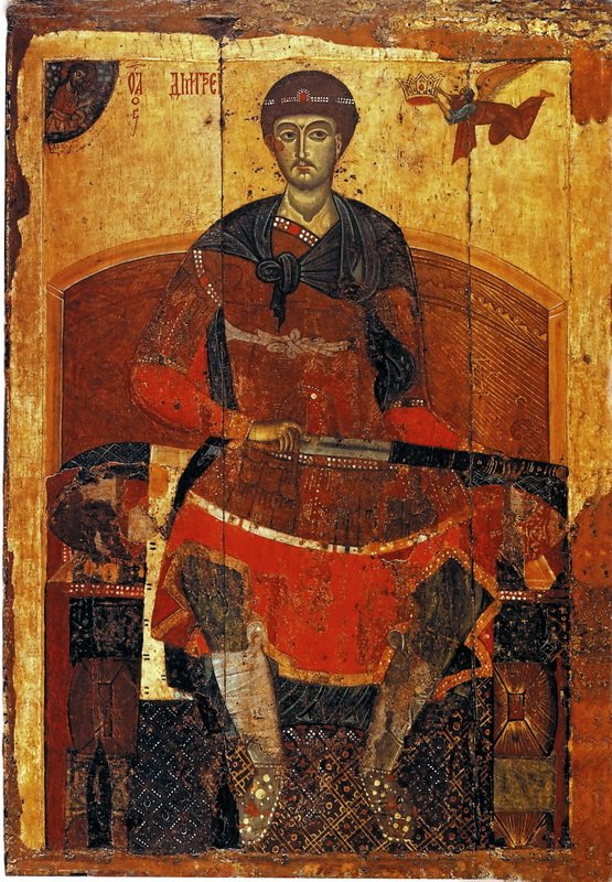 Мы видим образ воина — мудрого, уравновешенного, дышащего внутренней силой. Сдержанный, полный достоинства великомученик Димитрий Солунский наполовину извлек меч из ножен. Он был небесным патроном
