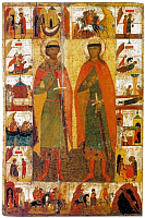Другая важная тема эпохи Куликовской битвы — военный подвиг, доблесть на поле брани, противостояние «безбожным агарянам» (ордынцам). Еще одна житийная икона страстотерпцев Бориса и Глеба, первых русских святых, вводит нас в эту плоскость переживаний. Святые