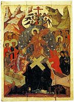 Исключительно гармонична икона из Коломны «Воскресение Христово — Сошествие во ад». Тема Воскресения, Возрождения всей Русской земли и каждого ее обитателя в широком смысле этого слова также была исключительно важна. Уже современники чувствовали совершенно необычное воодушевление, духовное движение, соединенное с политическими переменами. О княжении святого благоверного князя Димитрия Донского говорили так: «и вскипе земля Русская в дни княжения его». Воскресение Христово — центр нашей веры, что так точно выражено в пирамидальной композиции иконы, где все и всё устремляется ко Христу. Первыми освобождаются от уз ада прародители Адама и Евы, затем праотцы, пророки, праведники. Это воскресение возможно благодаря внутреннему очищению, стяжанию святости, добродетелям. Мастер иконы поместил в мандорле (сиянии вокруг фигуры Христа) белые сферы, где были подписаны эти добродетели: любовь, мир, долготерпение и другие.