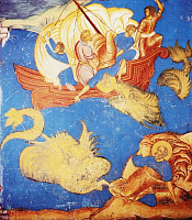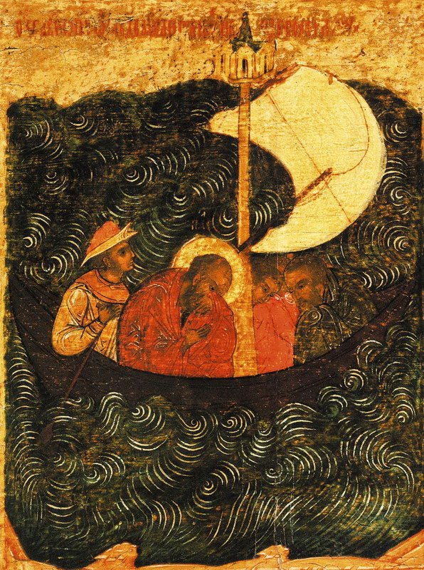 Сюжет храмовой росписи, известный с раннехристианских времен — пророк Иона, ввергнутый в море и поглощенный китом, при всей драматичности ситуации никогда не воспринимался зрителем как иллюстрация страшной смерти — и не только потому, что пророк Божий был сохранен живым и невредимым. Главный смысл этого события Ветхого Завета — прообраз Крестной смерти и трехдневного пребывания Спасителя во гробе: как Иона был во чреве кита три дня и три ночи, так и Сын Человеческий будет в сердце земли три дня и три ночи (Мф. 12:40). На фреске XVII в. в Тутаевской церкви художник изобразил самые главные моменты библейского рассказа о пророке: страшный ветер рвет паруса корабля, волны почти захлестнули борта, и тогда корабельщики, взяли Иону и бросили его в море, и утихло море от ярости своей (Ион. 1:15).