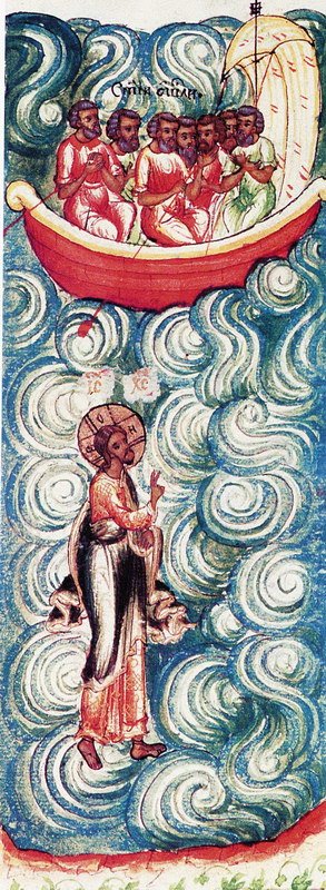 Неотъемлемой частью евангельских повествований о чудесах Иисуса Христа является Его призыв к ученикам уверовать; та же связь творимого чуда и необходимости веры видна в повествованиях о Его хождении по водам [Неклюдов]. Подобно этому, и миниатюры лицевых Евангелий с изображением совершаемых Спасителем чудес говорят: что вы так боязливы? как у вас нет веры? (Мк. 4:40)