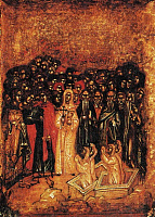Когда тело приносилось в храм, оно поставлялось среди церкви либо у двери храма, как поступили с гробом Макрины, сестры Григория Нисского43. Лицо усопшего оставалось в храме открытым. Этот вывод мы можем сделать опять благодаря замечанию святителя Григория Нисского, который писал, что девы, стоящие в храме, при гробе Макрины иногда прерывали песнопение, чтобы только посмотреть на лицо усопшей.