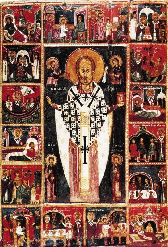 слепого и хромого», «Изгнание беса из дерева» («Посечение древа»), «Явление Николы епарху Евлавию во сне», «Никола кормит братию». Такой хорошо известный по житию сюжет, как заушение Ария, в клеймах тоже достаточно редок. Обычно эпизоды жития, касающиеся Первого Вселенского Собора и связанные с возвращением св. Николаю епископского достоинства, выносятся в медальоны на среднике иконы.