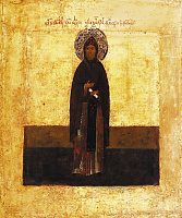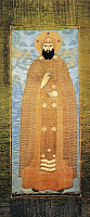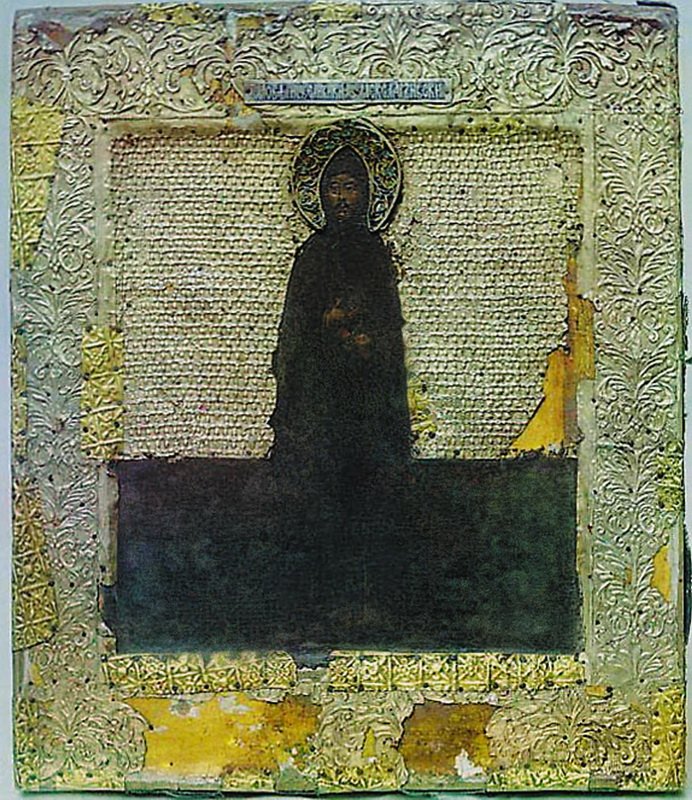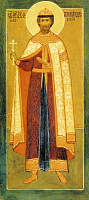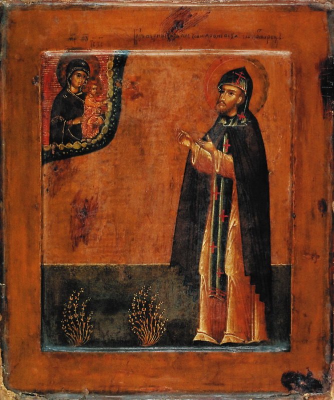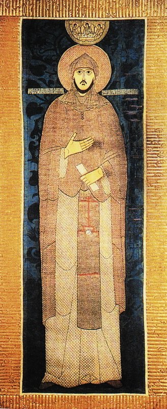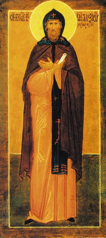 Изображения св.князя Александра Невского появляются в XVI в. после его канонизации. Согласно традиции, его, как принявшего перед смертью схиму, изображали в монашеских одеждах (мантия, куколь).
