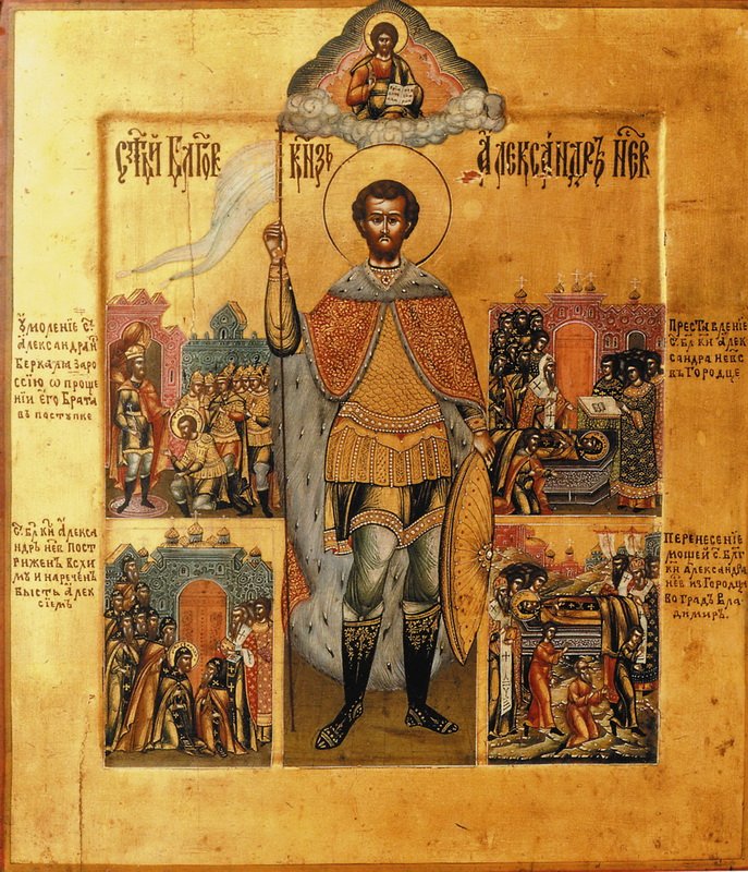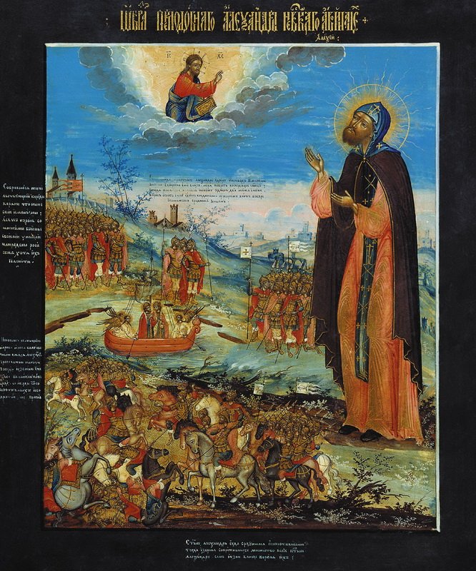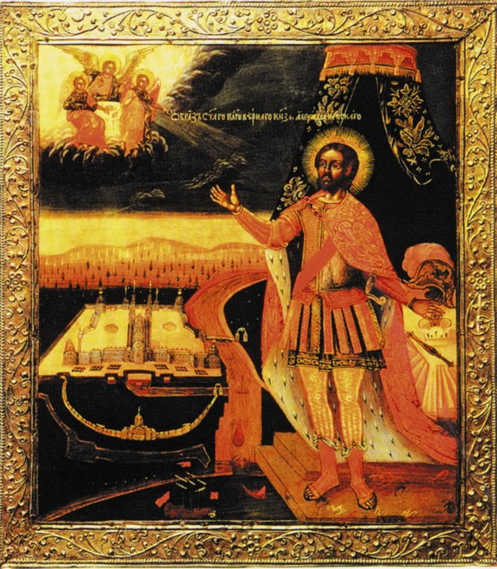 Встречаются отдельные иконы с изображением князя на фоне Невской битвы (ГМИР).