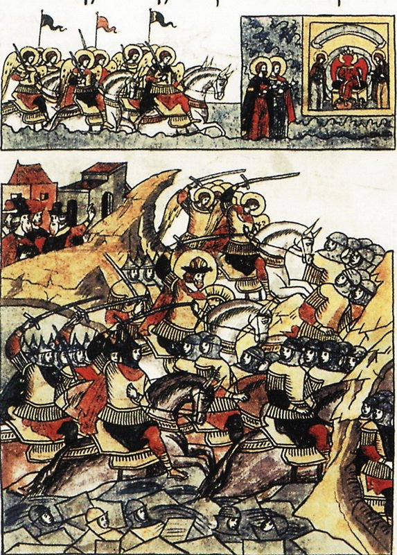 Миниатюра Лицевого Летописного свода, иллюстрирующая битву на Чудском озере, показывает помощь Небесного воинства князю Александру Невскому.