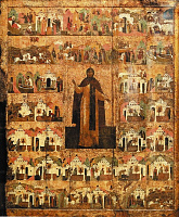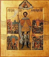 В XVIII в. появится также серия изображений Александра Невского с малым житийным циклом, состоящим из четырех клейм. Например, на иконе «Святой Александр Невский со сценами жития» второй половины XVIII в., написанной в селе
