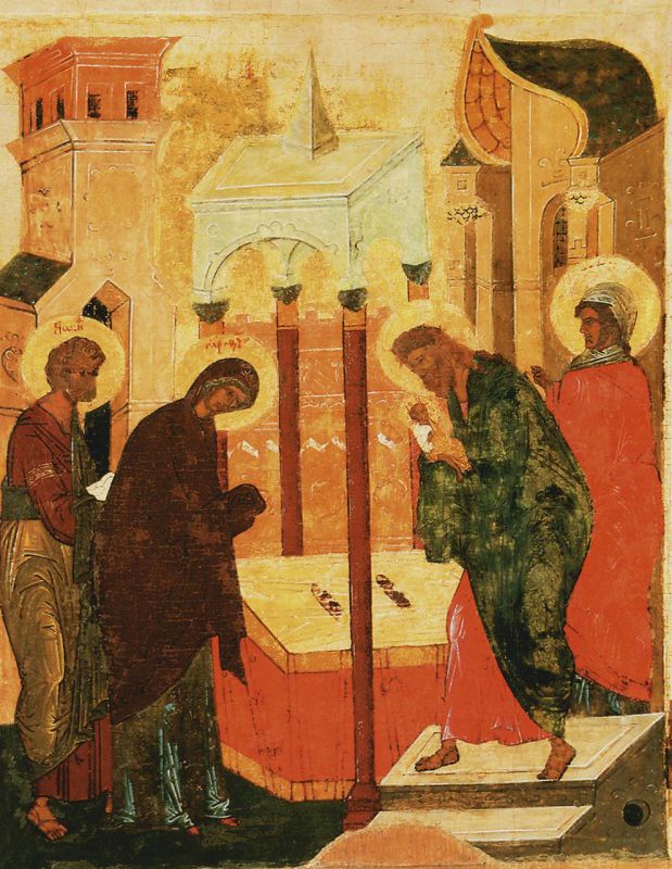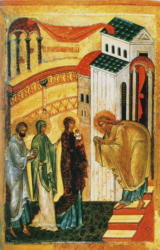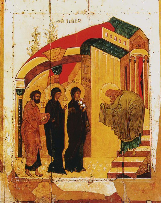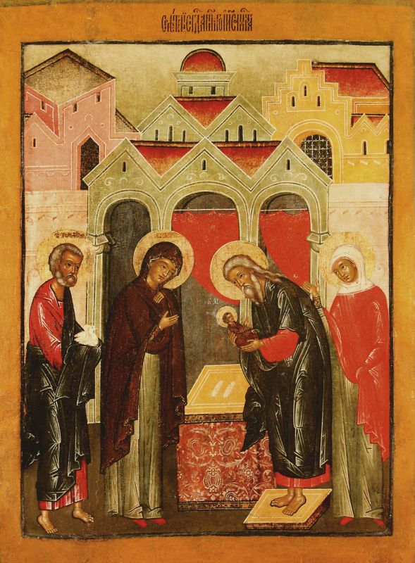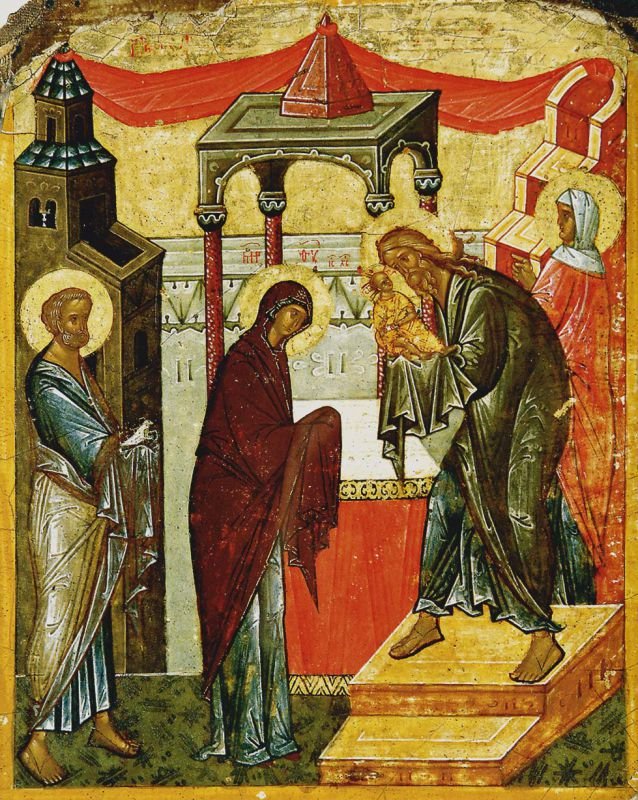 Взоры и Самой Пречистой Девы, и Ее Сына устремлены в Храм — или непосредственно на старца Симеона — святителя и праведника. Принимая Младенца в свои объятия, Симеон возрадовался, взывая: Бог есть Сей, Отцу Соприсносущный, и Избавитель душ наших (