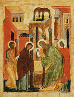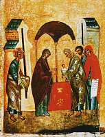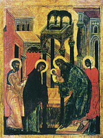 Тема Престола Божия — а именно на него восходит сорокадневный Христос Еммануил — отражена и в такой существенной детали, как покрытые краем одежды руки Богоприимца: уже не старец держит Богомладенца Христа, но Он держит просящего отпущения Симеона (ср. припевы