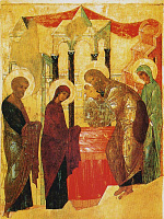 Иногда Престол помещен на втором плане, но более выразительным представляется размещение его между Пресвятой Девой и Симеоном Богоприимцем. Она уже отдала Своего Единородного Сына на будущие страдания; Она услышала и в полной мере поняла слова Симеона: Се, лежит Сей на падение и на восстание многих в Израиле и в предмет пререканий, — и Тебе Самой оружие пройдет душу, — да откроются помышления многих сердец (Лк. 2:34–35) Как уместен здесь багряный цвет Престола! Единородный Сын Божий, избавляя земнородных от вечной погибели, даже до ада снизойдет, всем пленным подаст освобождение (канон, песнь