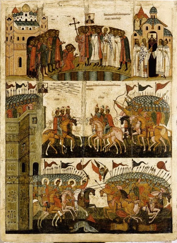 Очень интересны миниатюры Лицевого Летописного Свода (1560–1570), относящиеся к Житию благоверного великого князя Александра Невского. Здесь тоже немало батальных сцен, но главное, они ясно показывают, как воспринимал эти победы сам Александр Невский: он молился. Мы видим князя Александра, молящегося перед иконой Живоначальной Троицы в Псковском соборе, видим его торжественную встречу в Пскове и Новгороде — крестным ходом выходили встречать! — и понимаем, что он воспринимал свои победы не как личную свою заслугу, даже не как заслугу своей дружины, но как благословение Божие: Его десница и святая мышца Его доставили победу (Пс. 97:1).