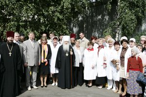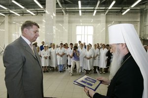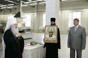 Затем в новом здании предприятия состоялась торжественная часть, на которой Владыка Ювеналий преподнес в дар хлебокомбинату икону Божией Матери "Спорительница хлебов", указывая, что Царица Небесная является "Помощницей людям в их трудах по снисканию хлеба насущного". Более тридцати сотрудников комбината, особо потрудившихся в деле возрождения духовной жизни в Подмосковье, были награждены Благословенными митрополичьими грамотами, а директор И.В. Ларин ? Благодарственной. Все участники торжественной встречи получили в благословение от Владыки сухарики, освященные в чугунке преподобного Серафима Саровского и его иконку.