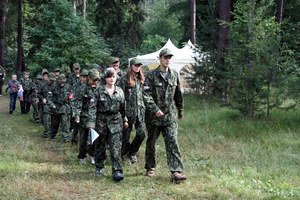 Некоторые родители последовали за ними в лагерь – посмотреть, где ребятам предстоит провести ближайшие две недели. Результатом осмотра остались довольны: хвойный лес, большая светлая поляна, аккуратный палаточный городок, везде сухо и чисто. Участников лагеря накормили обедом, затем выдали форму и распределили по отрядам.