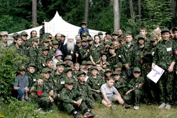 20 июня лагерь посетил Высокопреосвященнейший Ювеналий, Митрополит Крутицкий и Коломенский. Все восемьдесят участников лагеря встречали Владыку Митрополита, выстроившись вместе с вожатыми на главной площадке, и приветствовали его дружным хором: «Здравствуйте, Ваше Высокопреосвященство! Благословите, владыко!» - и проскандировали свой девиз, который избрали сами: «Мы не умрем, мы будем жить!». Владыка Ювеналий призвал на детей Божие благословение и пожелал им хорошо отдохнуть и подружиться, а затем вручил им подарки: фрукты и сладости, а также книги о святых воинах – «Небесные покровители Российского воинства». Сразу же Владыку обступили желающие получить его подпись на книге, и хотя ребят было много, никто не ушел разочарованным. Высокопреосвященнейший Ювеналий с интересом осмотрел лагерь (увидев палатку с надписью «Медсанчасть», Владыка, улыбнувшись, пожелал, чтобы она всегда пустовала), помолился вместе с детьми и благословил их трапезу. Уезжая из лагеря, Митрополит Ювеналий поблагодарил его организаторов за неформальный, творческий поход к работе с молодежью и выразил надежду, что лагерь пройдет успешно, а его участники получат духовную пользу и незабываемые впечатления.