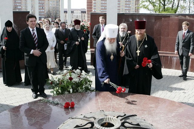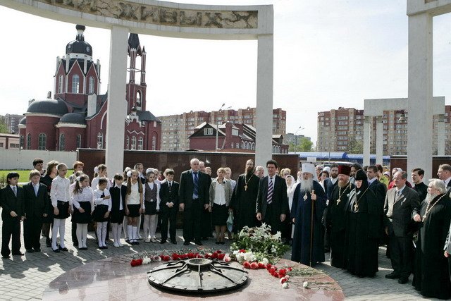После трапезы участники праздника совершили пасхальное поминовение «вождей и воинов, на поле брани убиенных» и возложили цветы к мемориалу павших воинов, расположенному неподалеку от ЗАО «Щелковохлеб».