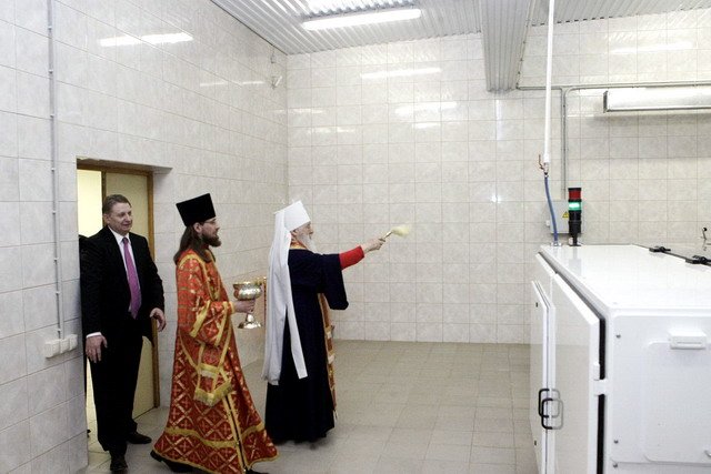 Затем Владыка освятил новый цех завода, совершив «последование над пещию» и окропив святой водой все помещения и оборудование. Митрополит Ювеналий сердечно поздравил работающих на предприятии, вручив коллективу ЗАО «Щелковохлеб» во главе с генеральным директором И.В. Лариным свою благословенную грамоту и каждому труженику образ Воскресения Христова. Игорь Викторович Ларин от лица всего коллектива «Щелковохлеб» сердечно поблагодарил Его Высокопреосвященство за визит и поздравление, вручив Владыке пасхальное яйцо с изображением святого великомученика Георгия Победоносца.