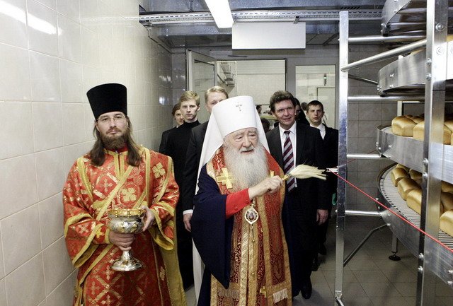 Видя стоящего здесь Игоря Викторовича, хочу специально сказать, что предприятие Щелковохлеб, возглавляемое им, показало особый жертвенный пример. Сотрудники завода согласно всем канонам Церкви начали выпекать у себя просфоры для многих благочиний Московской епархии. Предприятие благотворительно направляет хлеб в монастыри и храмы. В планах строительство новой просфорни, потому что спрос на выпекаемые здесь просфоры огромный. А сегодня на территории предприятия мы будем освящать место под строительство храма в честь иконы Божией Матери Спорительница хлебов и новый цех, призывая Божие благословение на труды тех, кто жертвенно служит Богу и людям.