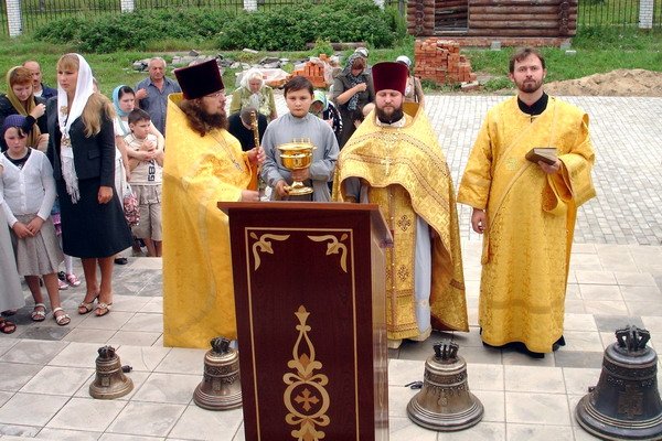 По заамвонной молитве отец настоятель с прихожанами вышли на паперть, где духовенство совершило чин освящения четырех колоколов для звонницы храма. Преображенская церковь это новосооруженный храм, который практически полностью готов к освящению.