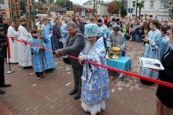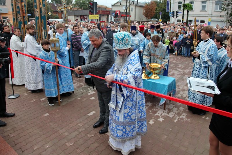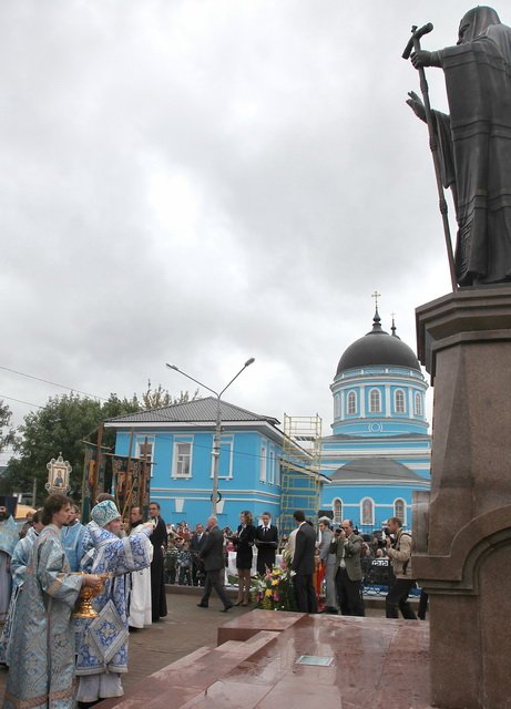 Архиепископ Григорий и В. Н. Лаптев перерезали алую ленту, натянутую перед монументом. Владыка Григорий совершил молебен и освятил памятник. Затем была отслужена заупокойная лития и провозглашена вечная память приснопамятному Святейшему Патриарху Пимену.