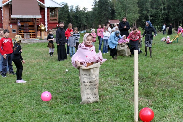Вслед за тем уставшим от дороги путникам было предложено вкусное угощение на свежем воздухе. Далее детей ждала программа спортивных мероприятий, организованных преподавателями воскресных школ. Затем юные паломники побывали на колокольне, где дети могли попробовать свои силы в качестве звонарей. На старинном кладбище внимание детей привлекли древние надгробия из белого камня.
