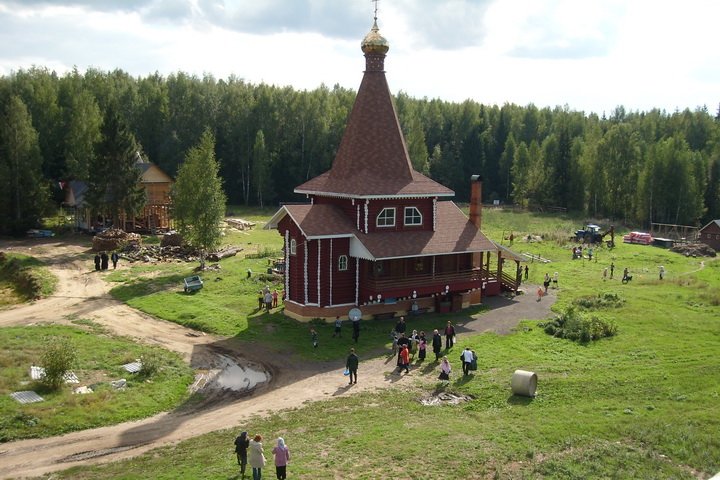 Дорога от деревни к храму пролегает по густому дремучему лесу. Множество муравейников, бережно огороженных деревянными брусками, вековые ели, поросшие мхом, пение птиц — все это благоприятно сказывалось на общем настроении группы. Путь к храму по лесным тропам особенную радость доставил детям. Вскоре паломникам открылся живописный вид: бревенчатый храм, окруженный хозяйственными постройками, с находящейся рядом каменной колокольней, единственной постройкой, сохранившейся после разрушения храма в