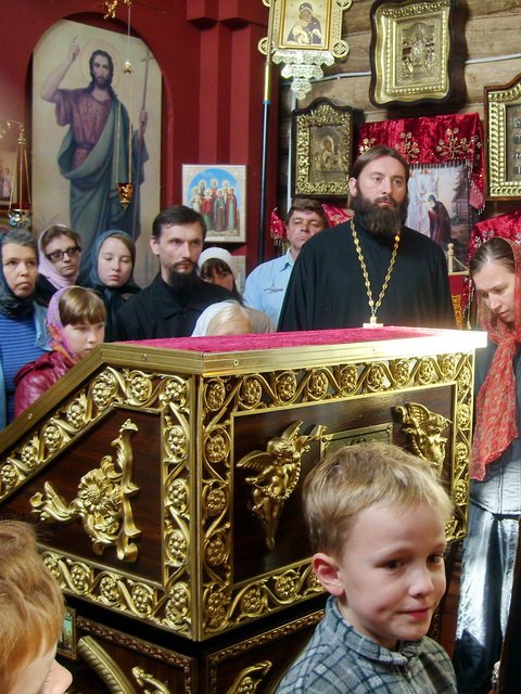 После благодарственного молебна с молитвой ко Пресвятой Троице отец Александр поблагодарил отца Дионисия за приложенные труды по восстановлению храма. Всем присутствующим были вручены листки с историей храма.