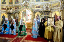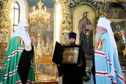 Ваше Святейшество, все, кто сегодня молился с Вами, на всю жизнь оставят в памяти Ваше благолепное Патриаршее служение. Но мы знаем, что при Вашей сверхчеловеческой активности в служении нужна Божия помощь, Божия поддержка, без которой слабый земнородный человек не может осуществлять великих дел. Мы просим Вас принять этот древний намоленный образ Пресвятой Владычицы нашей Богородицы с молитвенным пожеланием, чтобы Покров Царицы Небесной неотступно пребывал с Вами и в Вашем Первосвятительском служении.