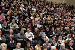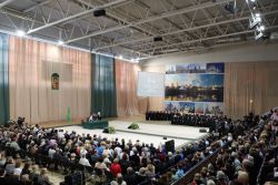 Бурными аплодисментами встретили своего Патриарха собравшиеся; их было более тысячи двухсот человек. Приветствуя Его Святейшество от лица собравшихся, митрополит Ювеналий сказал, с каким огромным интересом воспринимают священнослужители, верующие — все жители России слова Первосвятителя, высказанные им при посещении бескрайних просторов нашей страны. С завершением строительства храма начинается самое трудное, — вспомнил митрополит Ювеналий слова Святейшего Патриарха, сказанные в Петропавловске-на-Камчатке, — это пастырская деятельность.