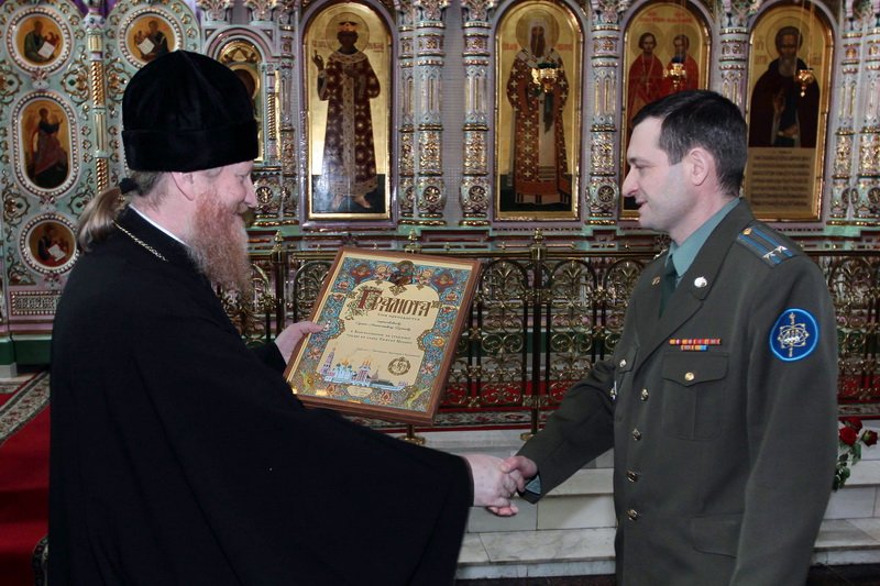 Военнослужащие и ветераны части получили в этот день грамоты благочиния и подарки. Заместитель командира воинской части 26178 подполковник С. А. Бутаев поблагодарил отца благочинного и протоиерея Алексия Никонова за вклад в дело духовного и патриотического воспитания настоящих и будущих защитников Отечества и вручил им юбилейные грамоты.