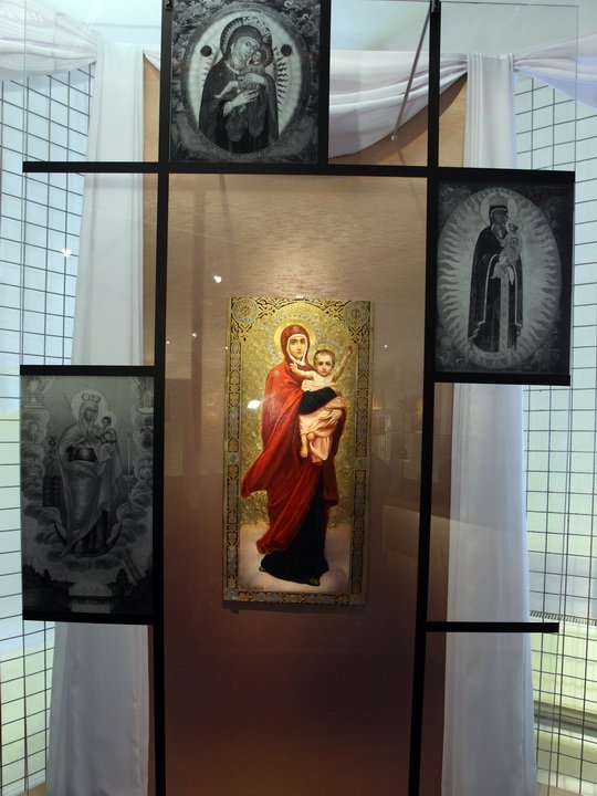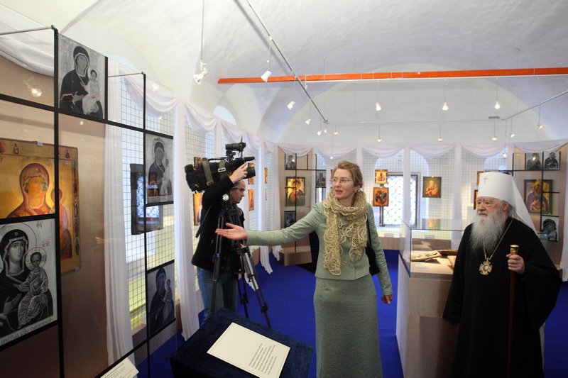 «Возлюбленные братья архипастыри, матушка игумения Маргарита, всечестные отцы, дорогие братья и сестры! Сегодня праздник Собора Пресвятой Богородицы. И если мы на ёлке дарим детям подарки, то сегодня в нашем монастыре православным христианам монашествующие и труженики приносят в дар Богородице очередную выставку икон, связанных с почитанием Пресвятой Владычицы нашей. Мы счастливы, что имеем возможность не только молиться в этом монастыре, но и продолжать вековые традиции Русской Православной Церкви. Я вспоминаю, какая трогательная была выставка в первый день января прошлого года: „Дети Рождеству Христову“. На этой выставке были представлены со всей Московской области поделки, игрушки и рождественские сувениры, сделанные детьми Подмосковья. А сегодня мы показываем то, что хранится в нашем монастыре — не музейного, а почитаемого изо дня в день. Тут и иконы, которые мы спасли от разрушения и отреставрировали их, а также иконы, которые в праздники Богоматери выносятся для почитания. Я счёл для себя честью и радостью дать на эту выставку свою келейную Смоленскую икону Божией Матери. Выставка была организована в очень короткое время — не больше, чем за десять дней. Когда я сказал матушке о намерении провести выставку, она нашла доброго человека, который здесь присутствует, и я хотел бы его представить: это Александр Никитович Конов, заслуженный художник Российской Федерации. Вчера вечером я посещал Софьины палаты, чтобы посмотреть, как готовится выставка. Матушка мне рассказала, что когда она попросила этого заслуженного человека организовать выставку и привела его сюда, он прошел, опустил голову, подумал, а потом с вдохновением стал говорить о том, как все организовать. И несмотря на то, что она в короткое время была собрана, вы почувствуете, посещая её, что сделана она не только с любовью и усердием, но и на высоком профессиональном уровне. Я хочу засвидетельствовать, что Церковь в контакте и в содружестве с деятелями культуры продолжала и будет продолжать совершать то, что было всегда в истории нашей Церкви, это доброе созидательное сотрудничество. Я прошу вас, дорогой Александр Никитович, как автора этого проекта, рассказать, как вам удалось за столь короткое время так прекрасно организовать выставку. И одновременно всех присутствующих здесь рад приветствовать и пригласить на выставку».
