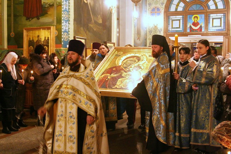 Встречал образ Пресвятой Богородицы настоятель храма протоиерей Андрей Коробков в сослужении соборного духовенства.