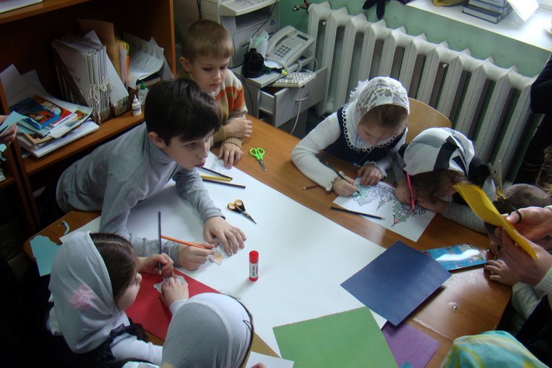 Впервые в олимпиаде принимали участие дети в возрасте 5–7 лет. Всего в этой группе было 24 участника, которых разделили на 4 команды, каждая из которых рассказывала молитву «Богородице Дево…», а потом создавала рисунок-аппликацию на тему: «Мой храм».